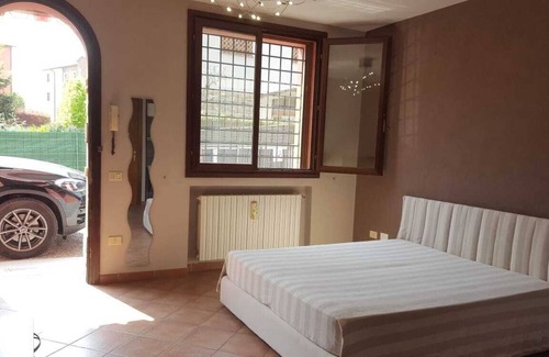 Apartment with independent entrance in the center of Casalgrande RE, ground floor: double bed with pillows and blanket sheets, TV and kitchen with all primary accessories available for cooking.