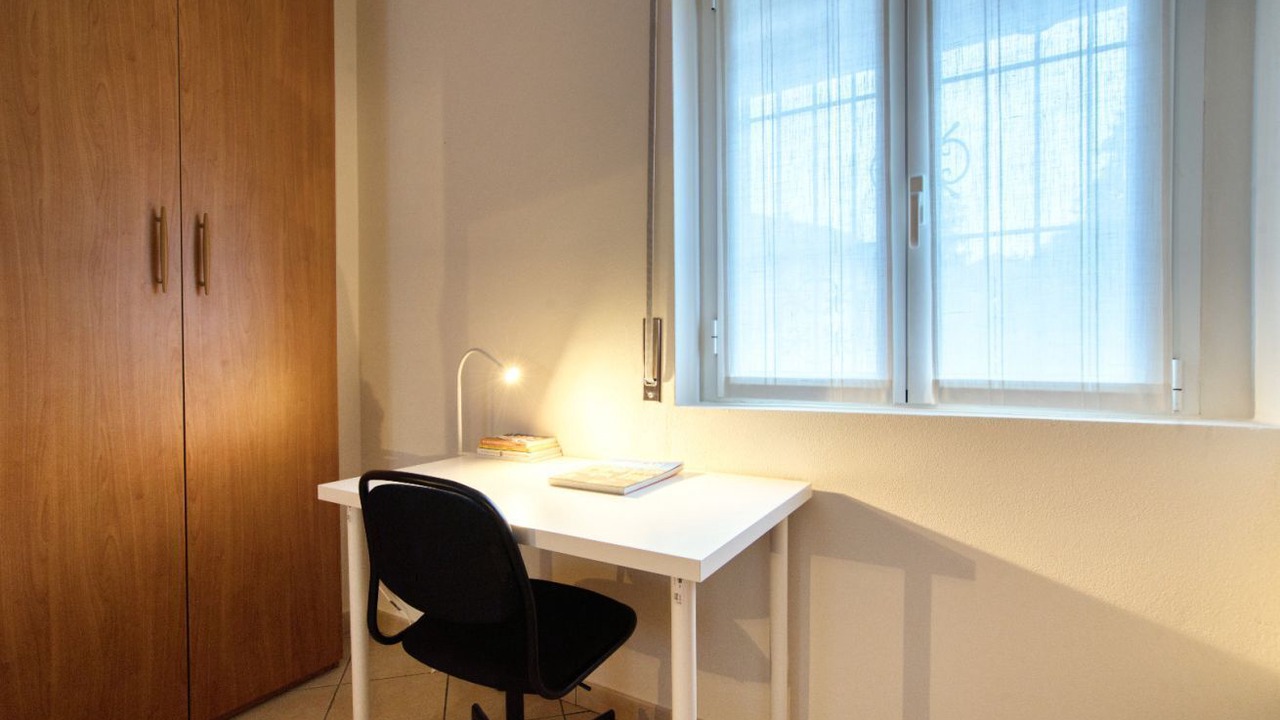 The sleeping area, on the other hand, consists of a large and comfortable built-in wardrobe, a double bed and a nice corner desk for working or studying under the window.
