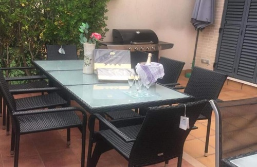 Interior and exterior terrace with furniture and barbecue.